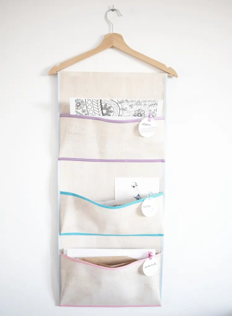 Das Hängeutensilo wird einfach auf einem normalen Bügel befestigt. Den Bügel kannst du überall aufhängen und auch mal weghängen – sehr praktisch und einfach. Das Wandutensilo hat drei Fächer, in die quer reingelegte DIN A4 Projekte, Hefte, Schnittmuster, Stoffproben oder oder oder reinpassen. Durch die Art, wie die Fächer angebracht werden, habe sie etwas Tiefe. Man kann also wunderbar reingreifen und auch etwas mehr drin verstauen, als nur Papier.