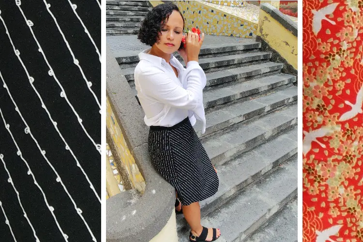 Der asymmetrischen Wickelrock besteht aus zwei verschiedenen Stoffen. Der schwarze Stoff mit dem wilden Nadelstreifen-Muster ist von Robert Kaufman. Tatsächlich habe ich den Rock schon so lange geplant, dass der Stoff mittlerweile ausverkauft ist (zumindest in schwarz). Die Idee funktioniert allerdings auch mit anderen gestreiften Stoffen.