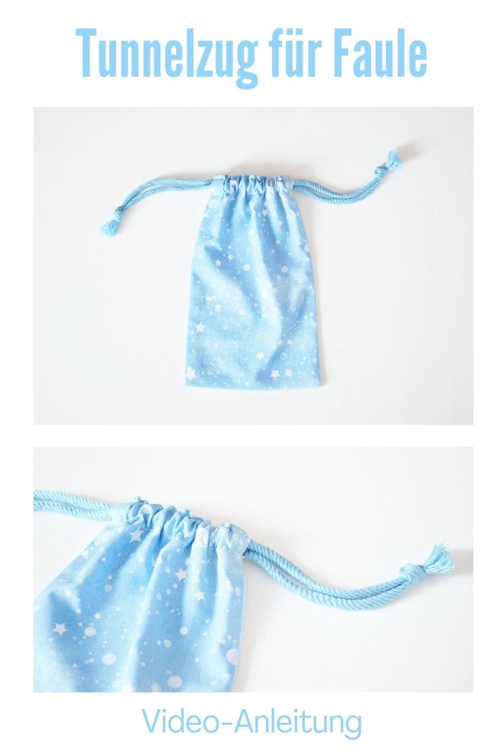 Einen Tunnelzug kannst du für jede Art von Beutel gut gebrauchen, zum Beispiel für Turnbeutel, Wäschebeutel oder Säckchen für den Adventskalender. Ob zwei Bänder oder ein Band, der Tunnelzug für Faule funktioniert in jedem Fall! In der Video-Anleitung hier unten auf der Seite zeige ich dir Schritt für Schritt, wie du ganz einfach einen Tunnelzug ohne lange Rumrechnerei nähen kannst. Egal welche Größe dein Beutel haben soll oder welche Art von Bändern du später durch den Tunnelzug ziehen möchtest. Wenn du den Trick einmal kennst, kannst du ihn immer wieder anwenden.